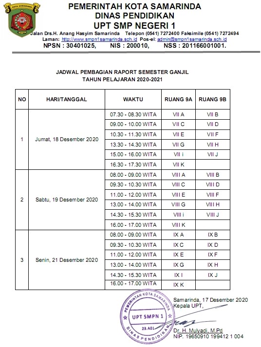 Berikut ini adalah jadwal pengambilan rapor PAS Ganjil Tahun Pelajaran 2020/2021